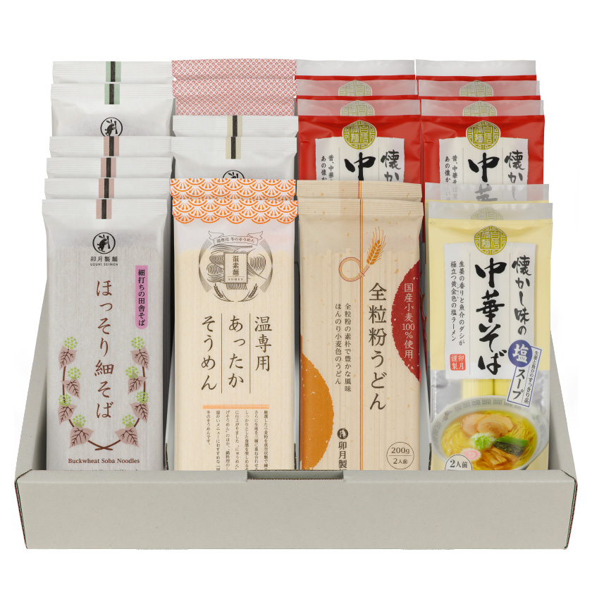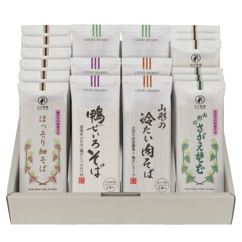 つめあわせ詳細 ・山形のさがえそば×2 ・ほっそり細そば×4 ・薫そば×2 ・本造りうどん×2 ・あったかそうめん×2 ・全粒粉うどん×2 ・中華そば(醤油)×2 ・中華そば(塩)×2 ・冷たい肉そば×2 ・鴨せいろそば×2 ・つけ蕎麦×2