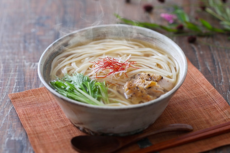 低温でじっくり24時間かけて仕上げた乾麺は、生麺のようなもっちりとした食感と粘りがあり、ゆで上げた後も伸びにくいのが特徴です。
