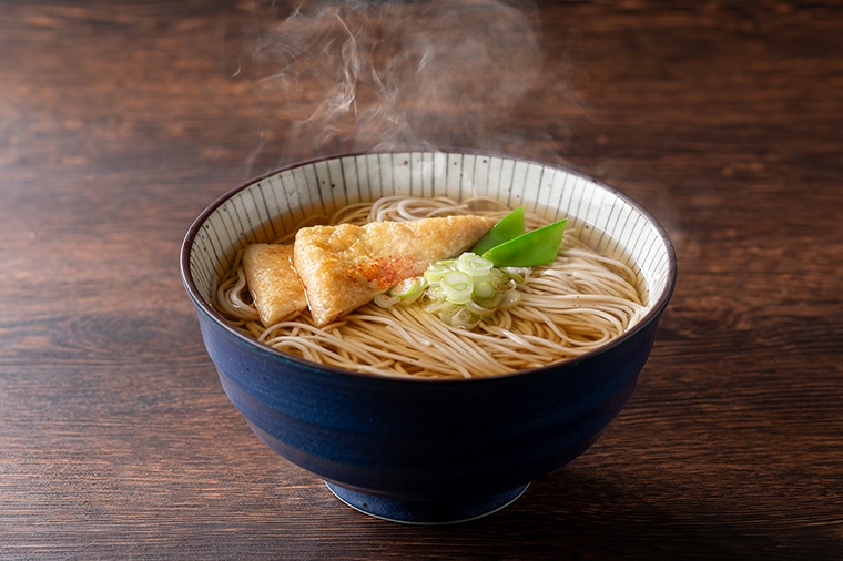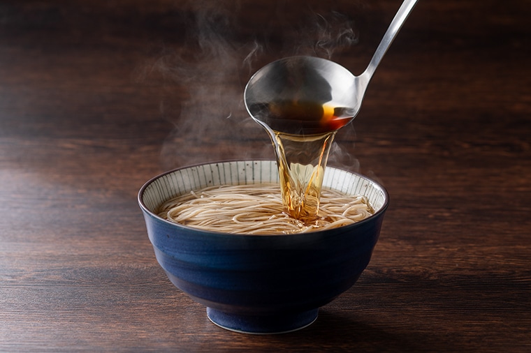枕崎産さば節削や、かつお節をじっくり煮出した一番だし、まろやかな昆布のうま味などを合わせた「かけそば専用」のつゆ。塩味と甘味のバランスを取り、うま味とコクを引き立たせた濃厚な味わいに仕上げました。芳醇なだしの香りが、お蕎麦の風味を引き立てます。