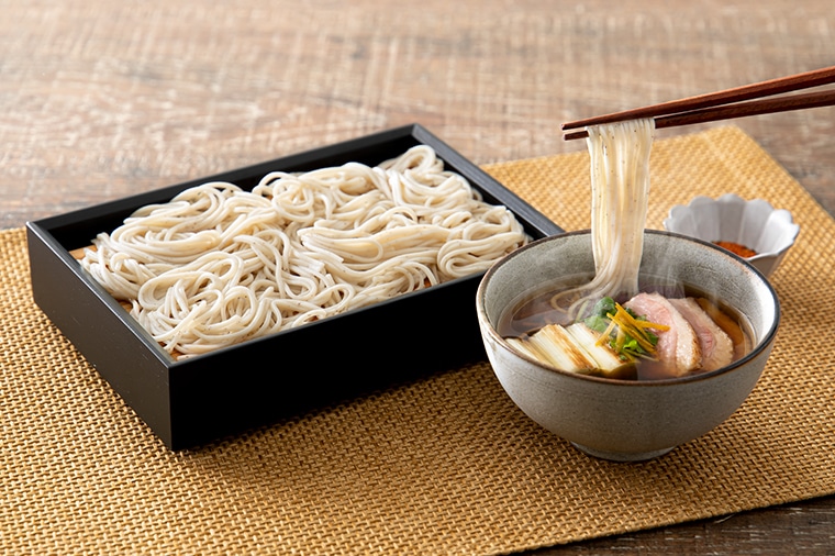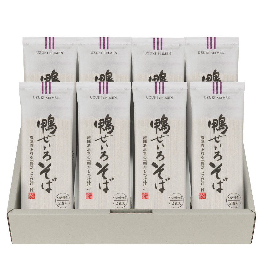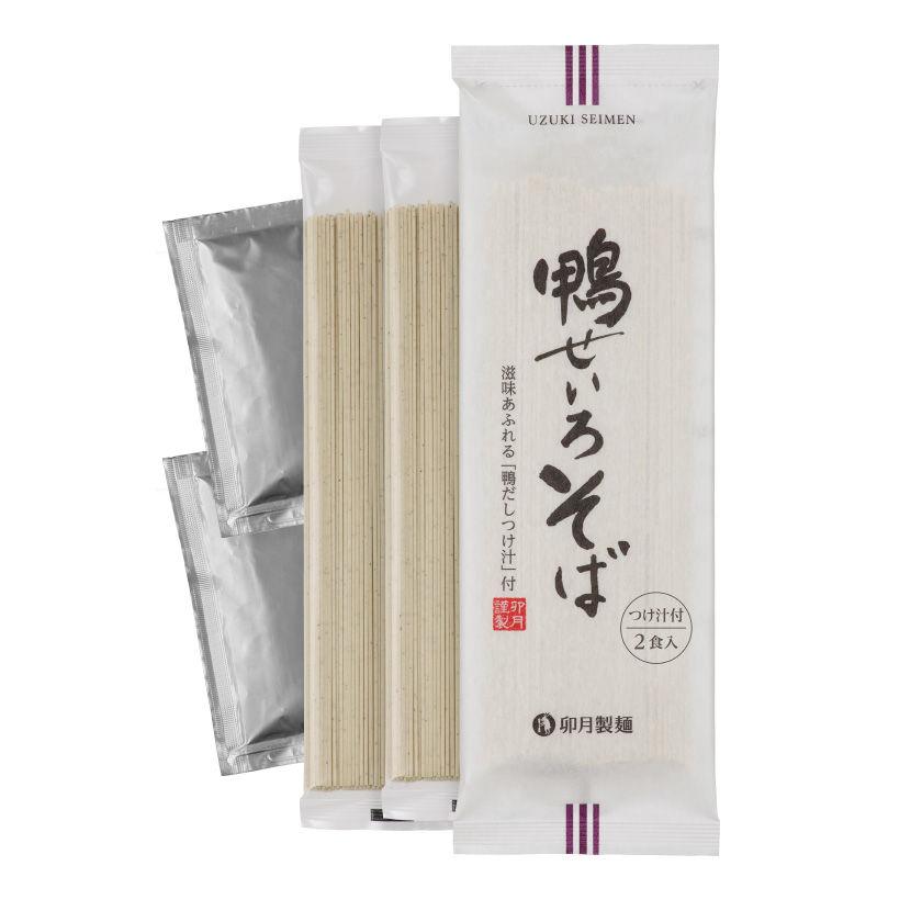 2食入りにリニューアルした「鴨せいろそば」は乾麺を1食分ずつ個包装しています。