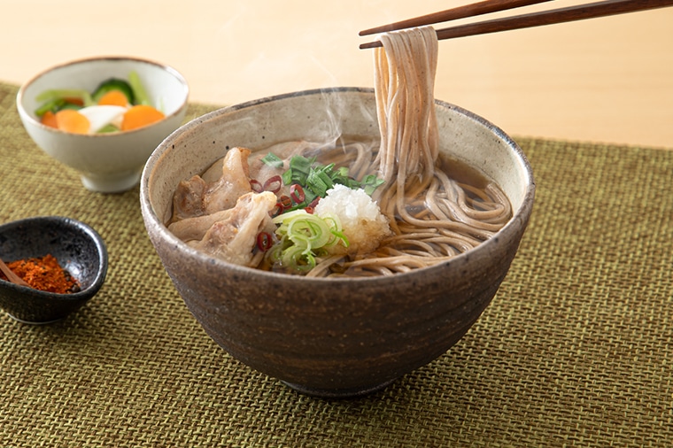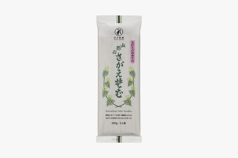 『山形のさがえそば』は、挽きぐるみのそば粉を原料に、そば処山形らしく太打ちにすることで、〝野趣あふれる太打ち蕎麦〟という言葉がふさわしい田舎蕎麦に仕上がっています。
