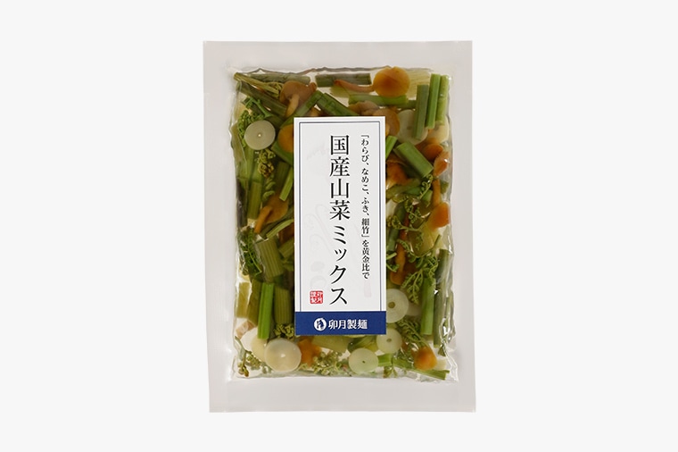 山形を中心に東北の厳しい自然に育まれた、懐かしい田舎のごちそう。完全無農薬の山菜(わらび、なめこ、ふき、細竹)を卯月製麺オリジナルの黄金比で配合し水煮にしました。山菜そばはもちろん、煮物、炊き込みご飯にもお使いいただけます。ほろ苦い素朴な味わいをお楽しみください。