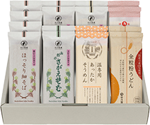 定番のお蕎麦3種「さがえそば」「ほっそり細そば」「薫そば」とつるつるモチモチの「本造りうどん」、冬の限定品2種「あったかそうめん」「全粒粉うどん」をつめあわせた冬を楽しめるセット。