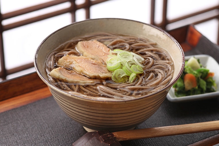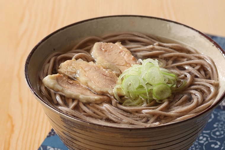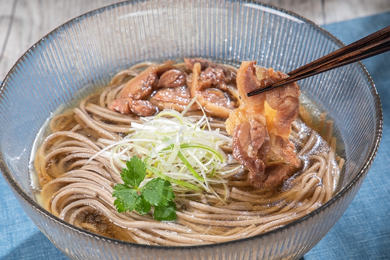 あっさり醤油味のスープに国産そば粉の太切り蕎麦と国産の親鶏肉をセットして、名店の美味しさを再現しました。