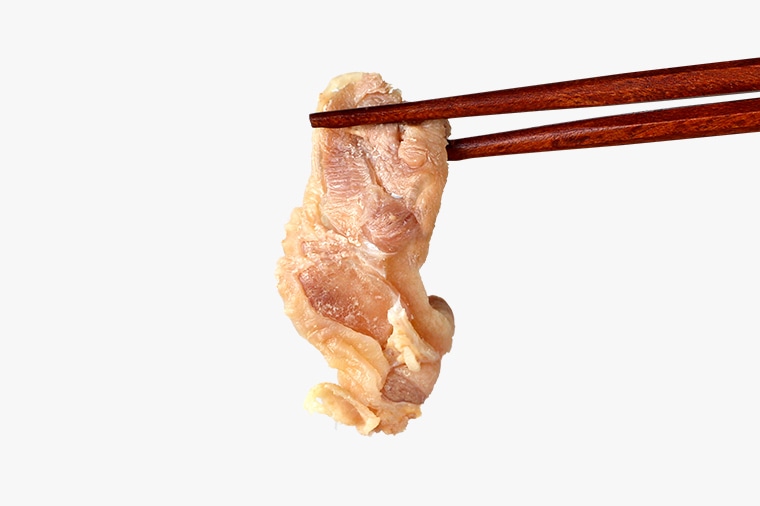 - ④鶏だしスープを溶いたどんぶりに水切りした麺を入れ、鶏肉(調味液は使用しません)と、輪切りにした長ねぎをのせて出来上がり。