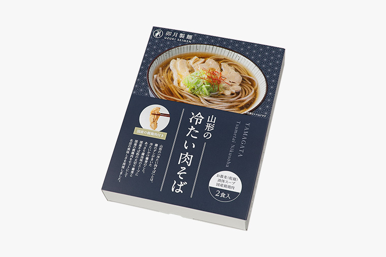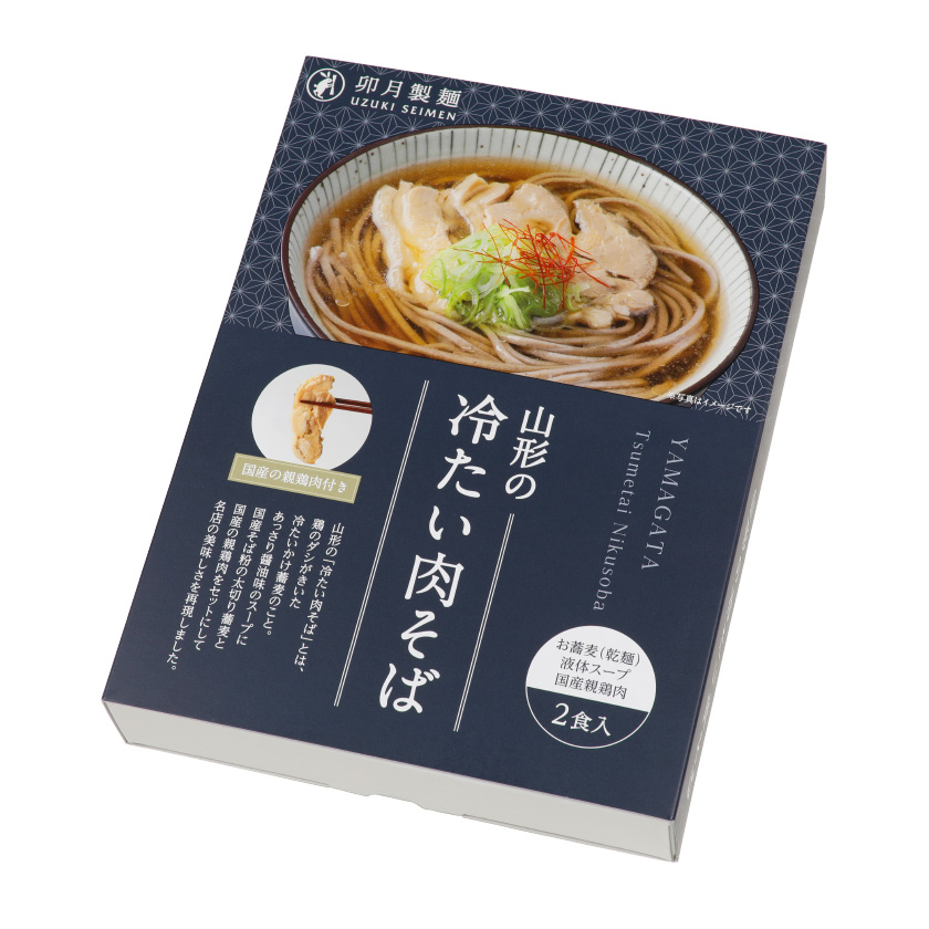 卯月製麺の「山形の冷たい肉そば」は、太切り蕎麦に本格スープ、地元名店と同じ親鶏肉をセットにしました。