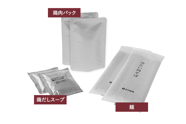 | 原材料名 | 【麺】小麦粉(国内製造)、そば粉、食塩、小麦たんぱく 【鶏だしスープ】しょうゆ、砂糖、ガラスープ、食塩、動物油脂、植物油脂、こんぶエキス、かつおぶしエキス、しいたけエキス、ジンジャーパウダー/調味料(アミノ酸等)、アルコール、酸化防止剤(ビタミンE)、(一部に小麦・大豆・鶏肉・豚肉・ゼラチンを含む) 【鶏肉パック】鶏肉、しょうゆ、みりん、砂糖、水あめ、清酒、風味調味料(かつお等)、醸造酢/トレハロース、調味料(アミノ酸等)、(一部に小麦・大豆・鶏肉を含む) |